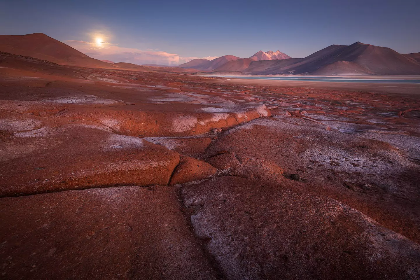 We had arrived with time to spare, and I’d been hoping for a sky that would match the foreground — something dramatic above the red rocks. The sunset came and went without much to show for it. A bland sky, fading light, and the slow realisation that the photograph I’d been composing in my head was not going to happen. The last tour vans had left a while ago, making sure their passengers would reach San Pedro de Atacama before dinner. The remaining footprints in the dry gravel were the only proof they had ever been here.