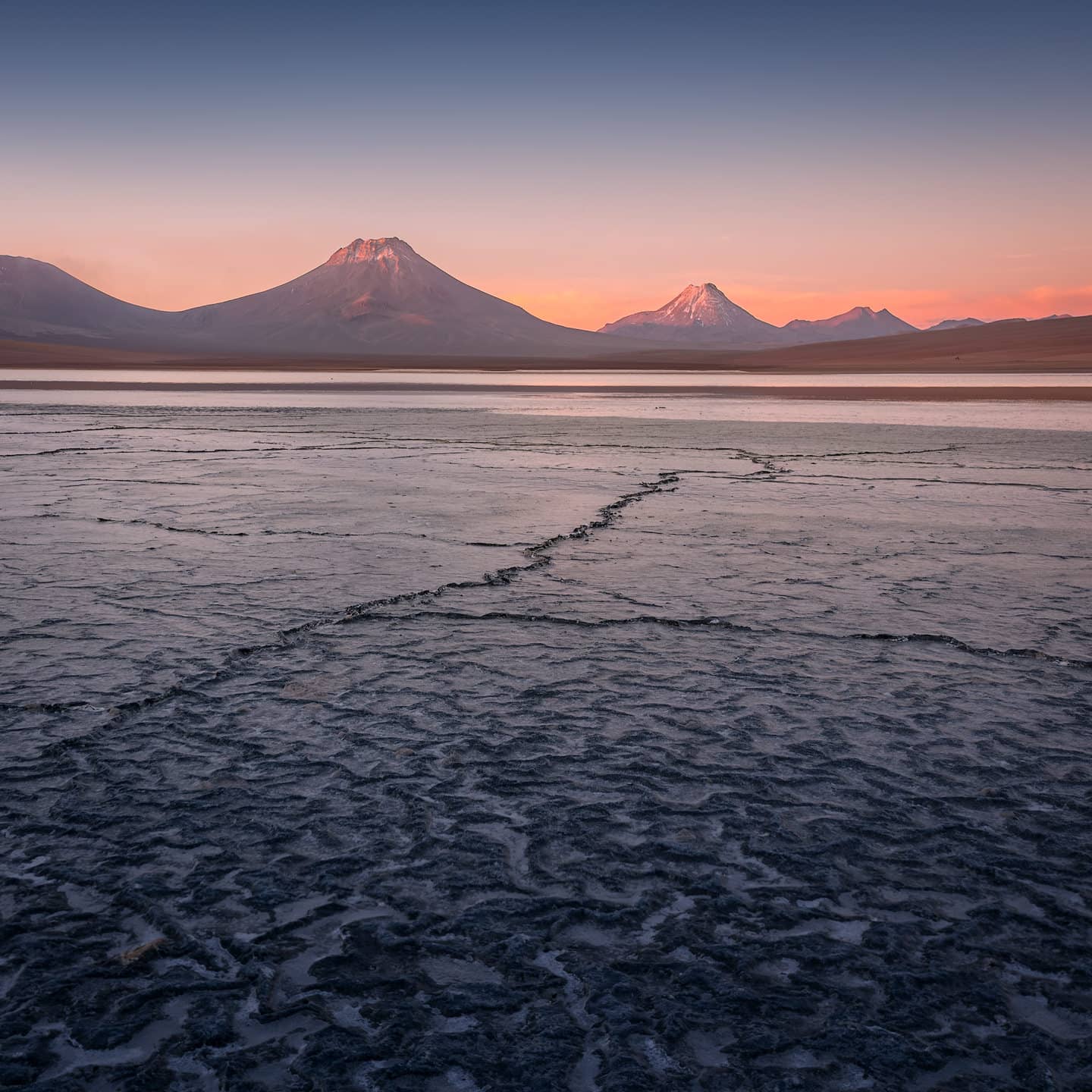 The Altiplano and the Cordillera Occidental operate on entirely different terms. At 3,800–4,500 meters, the air is thin and luminous, the landscape almost geometric in its severity. Volcanic cones rise above salt flats with near-perfect symmetry; dawn light at altitude carries a quality unavailable at lower elevations. After a Bolivian winter storm, that light turns disruptional — as I witnessed in these post-storm conditions at Salar de Surire. On calmer nights, it becomes still and calm — letting you soak in a moonrise above Piedras Rojas.
